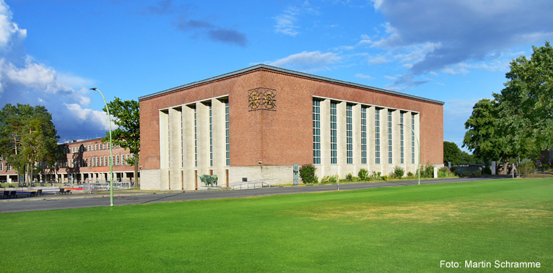 Schwimmhaus, Turnhaus und Haus des Deutschen Sports rund um den Jahnplatz vom Hindenburgplatz aus gesehen